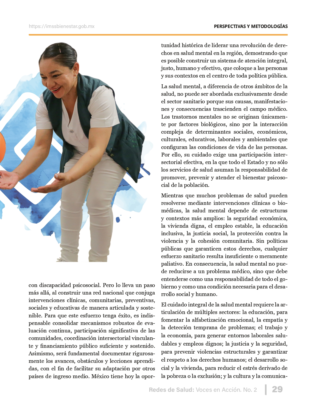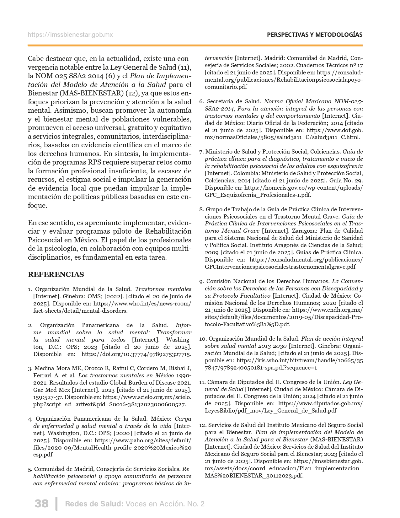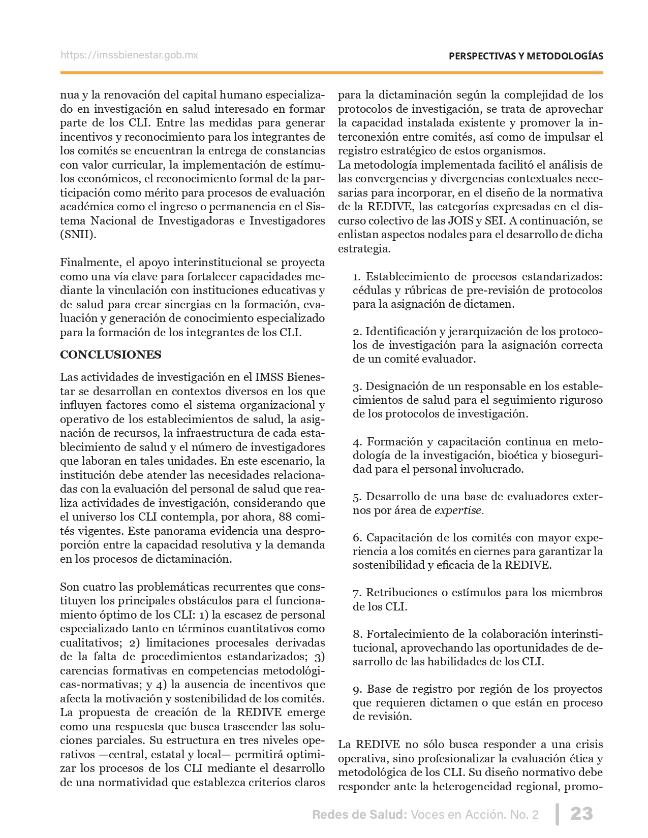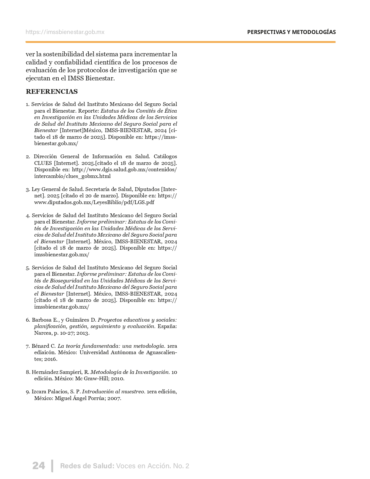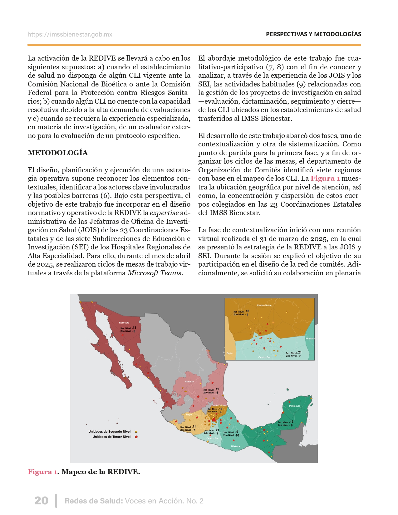 La revista considera investigaciones originales sobre sistemas de salud, con un énfasis en trabajos innovadores y de alto impacto clínico, científico y político. Su enfoque integra una diversidad de perspectivas, promoviendo el análisis crítico y reflexivo de los desafíos contemporáneos en los modelos de atención. Con una clara vocación social, la revista busca ser un referente en la difusión de conocimientos que contribuyan al fortalecimiento de sistemas de salud públicos, universales y equitativos, orientados al bienestar colectivo y la justicia sanitaria. Cada número de la revista está compuesto por diversas secciones que reflejan el carácter plural e interdisciplinario de Redes de Salud: Voces en Acción, entre ellas se encuentran: Editorial institucional; Voces desde el territorio, dedicada a entrevistas con actores comunitarios; Salud en contexto, con experiencias institucionales y análisis operativos; Perspectivas y metodologías, donde se exploran enfoques teóricos y técnicos innovadores; Semillero clínico y Reporte de casos, que visibilizan contribuciones formativas; e Investigación original, con artículos científicos que aportan al debate en salud pública y bienestar social. La revista constituye un órgano oficial de difusión científica del IMSS Bienestar. Opera como una publicación periódica con revisión por pares (doble ciego).