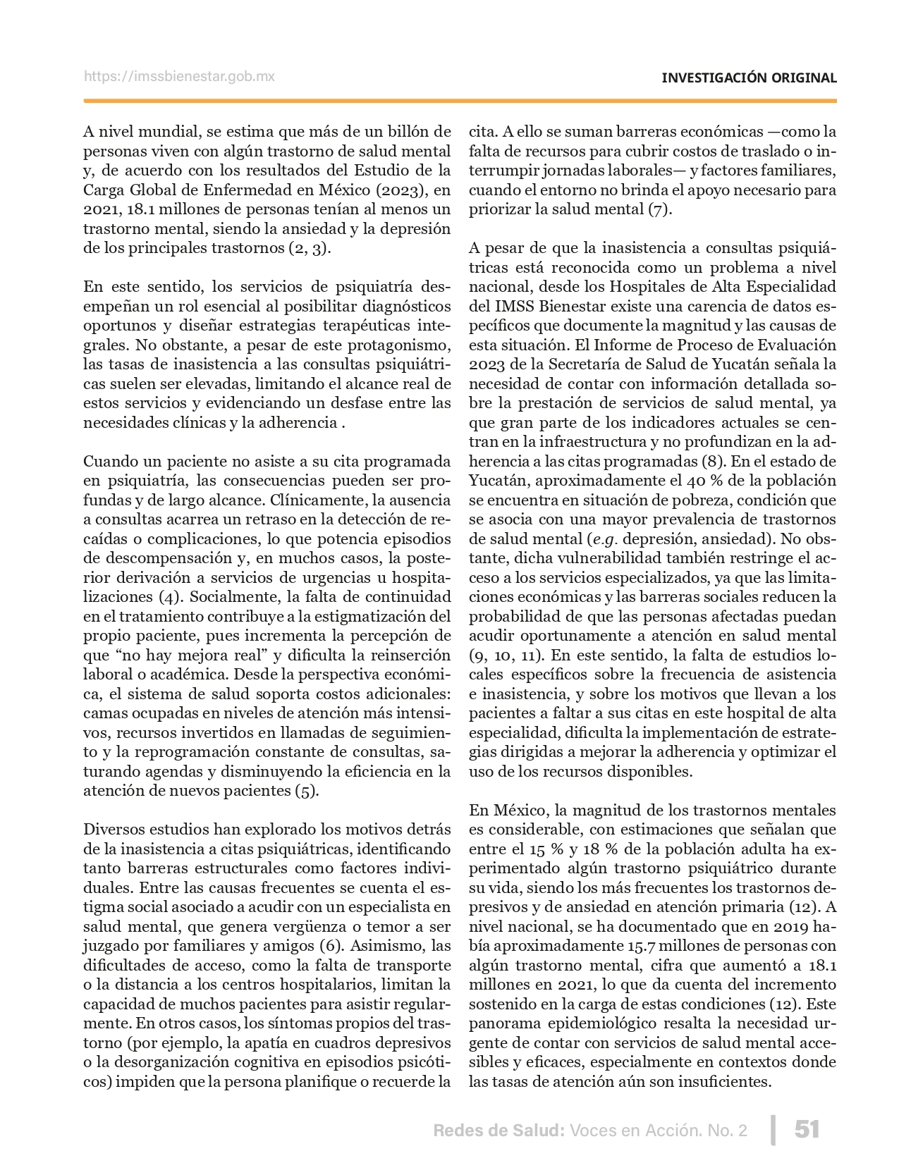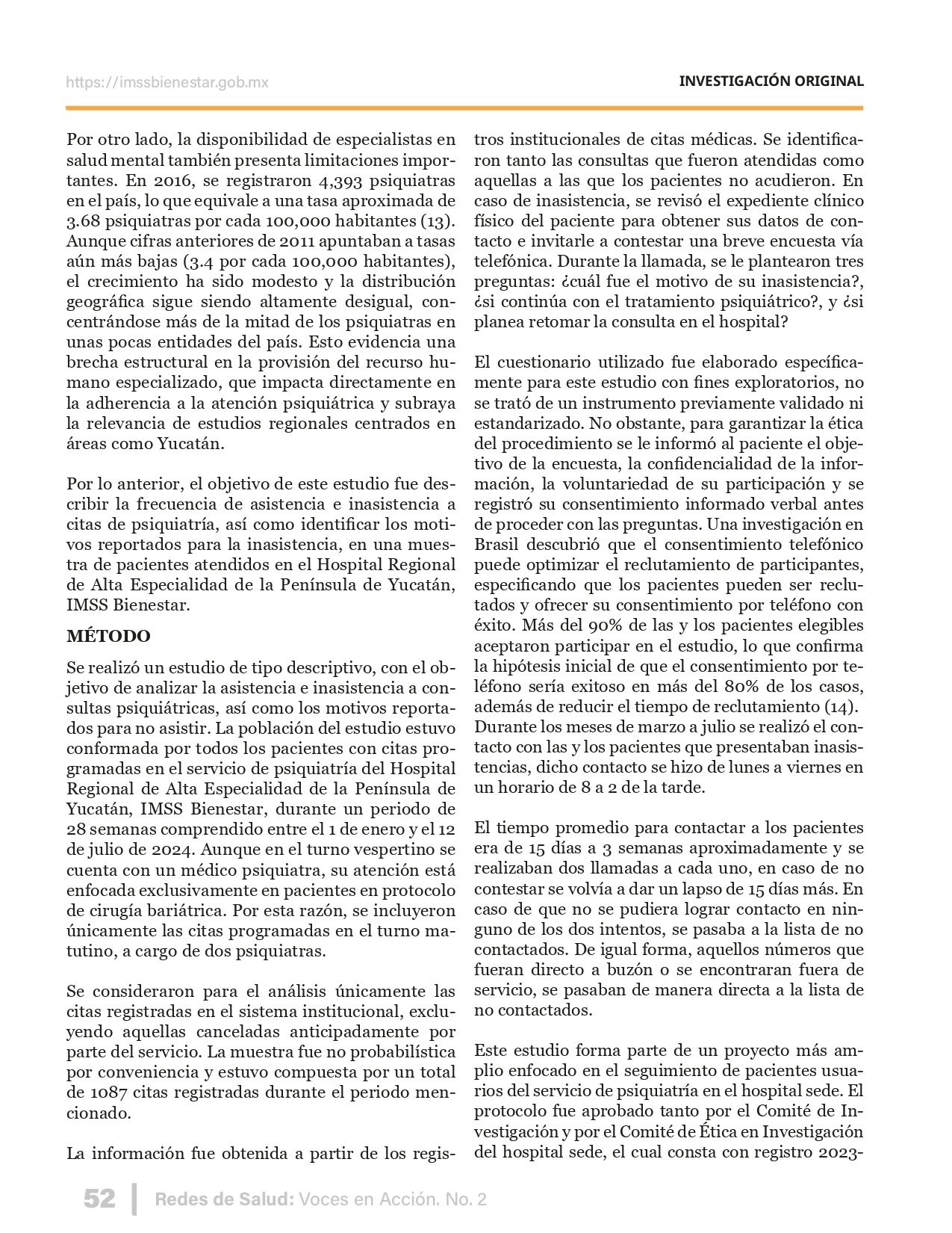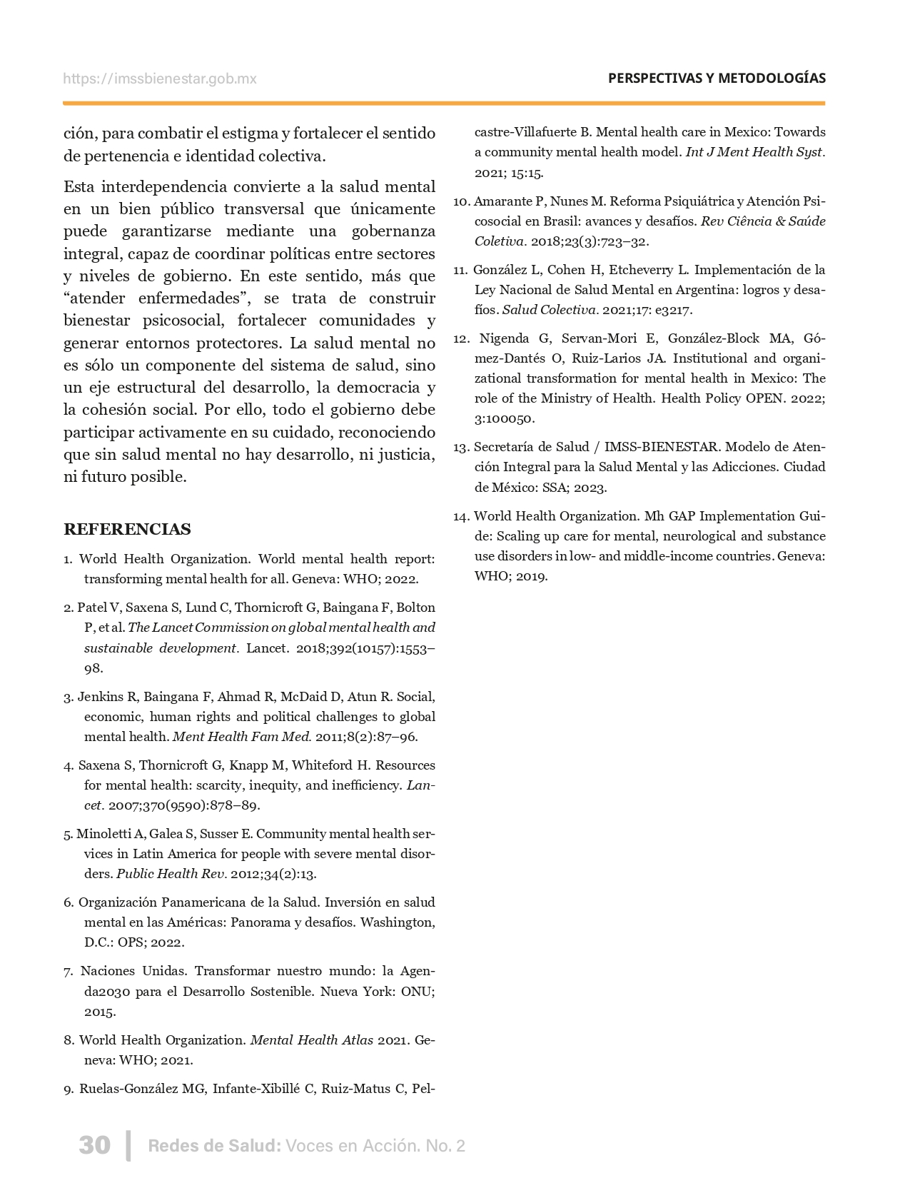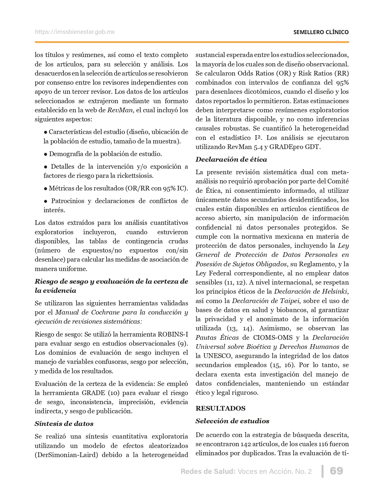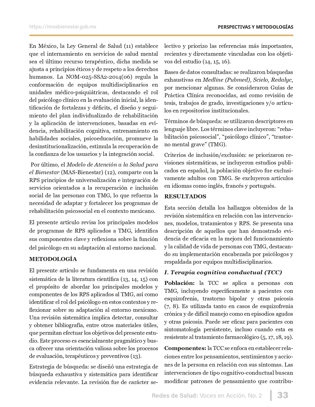 La revista considera investigaciones originales sobre sistemas de salud, con un énfasis en trabajos innovadores y de alto impacto clínico, científico y político. Su enfoque integra una diversidad de perspectivas, promoviendo el análisis crítico y reflexivo de los desafíos contemporáneos en los modelos de atención. Con una clara vocación social, la revista busca ser un referente en la difusión de conocimientos que contribuyan al fortalecimiento de sistemas de salud públicos, universales y equitativos, orientados al bienestar colectivo y la justicia sanitaria. Cada número de la revista está compuesto por diversas secciones que reflejan el carácter plural e interdisciplinario de Redes de Salud: Voces en Acción, entre ellas se encuentran: Editorial institucional; Voces desde el territorio, dedicada a entrevistas con actores comunitarios; Salud en contexto, con experiencias institucionales y análisis operativos; Perspectivas y metodologías, donde se exploran enfoques teóricos y técnicos innovadores; Semillero clínico y Reporte de casos, que visibilizan contribuciones formativas; e Investigación original, con artículos científicos que aportan al debate en salud pública y bienestar social. La revista constituye un órgano oficial de difusión científica del IMSS Bienestar. Opera como una publicación periódica con revisión por pares (doble ciego).