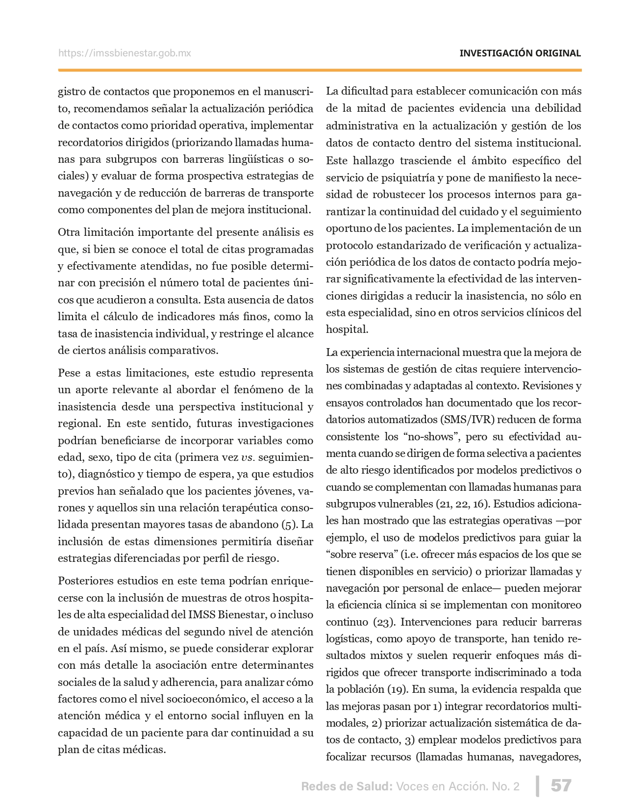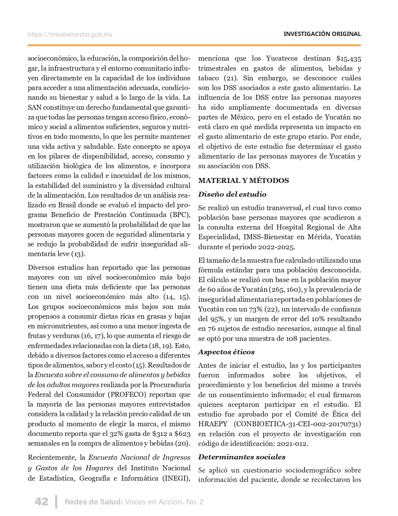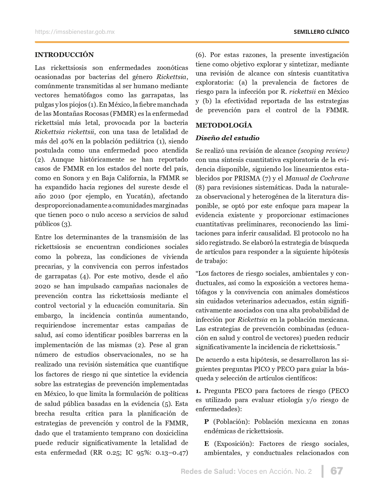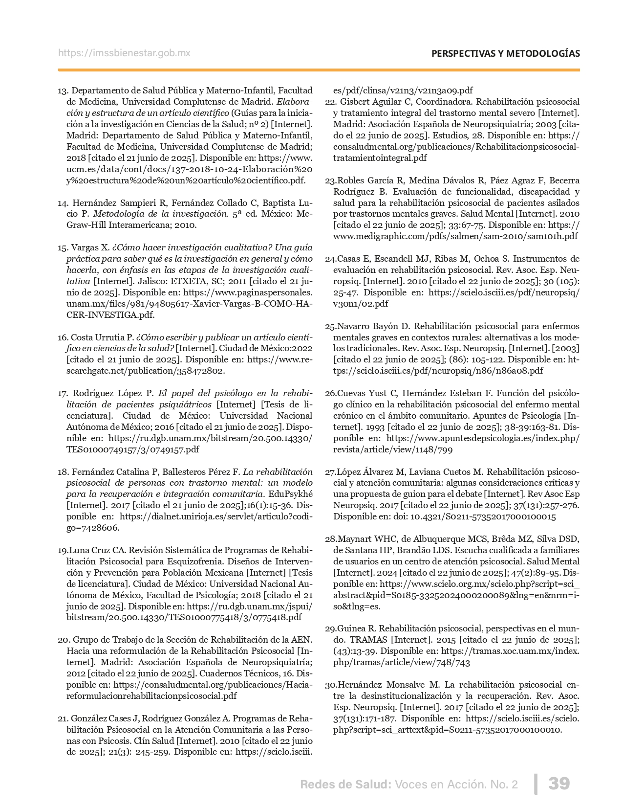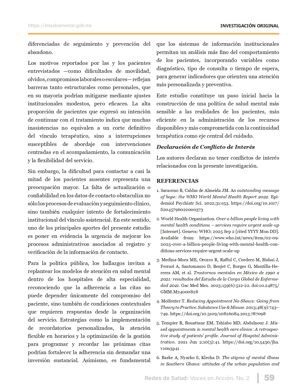 La revista considera investigaciones originales sobre sistemas de salud, con un énfasis en trabajos innovadores y de alto impacto clínico, científico y político. Su enfoque integra una diversidad de perspectivas, promoviendo el análisis crítico y reflexivo de los desafíos contemporáneos en los modelos de atención. Con una clara vocación social, la revista busca ser un referente en la difusión de conocimientos que contribuyan al fortalecimiento de sistemas de salud públicos, universales y equitativos, orientados al bienestar colectivo y la justicia sanitaria. Cada número de la revista está compuesto por diversas secciones que reflejan el carácter plural e interdisciplinario de Redes de Salud: Voces en Acción, entre ellas se encuentran: Editorial institucional; Voces desde el territorio, dedicada a entrevistas con actores comunitarios; Salud en contexto, con experiencias institucionales y análisis operativos; Perspectivas y metodologías, donde se exploran enfoques teóricos y técnicos innovadores; Semillero clínico y Reporte de casos, que visibilizan contribuciones formativas; e Investigación original, con artículos científicos que aportan al debate en salud pública y bienestar social. La revista constituye un órgano oficial de difusión científica del IMSS Bienestar. Opera como una publicación periódica con revisión por pares (doble ciego).