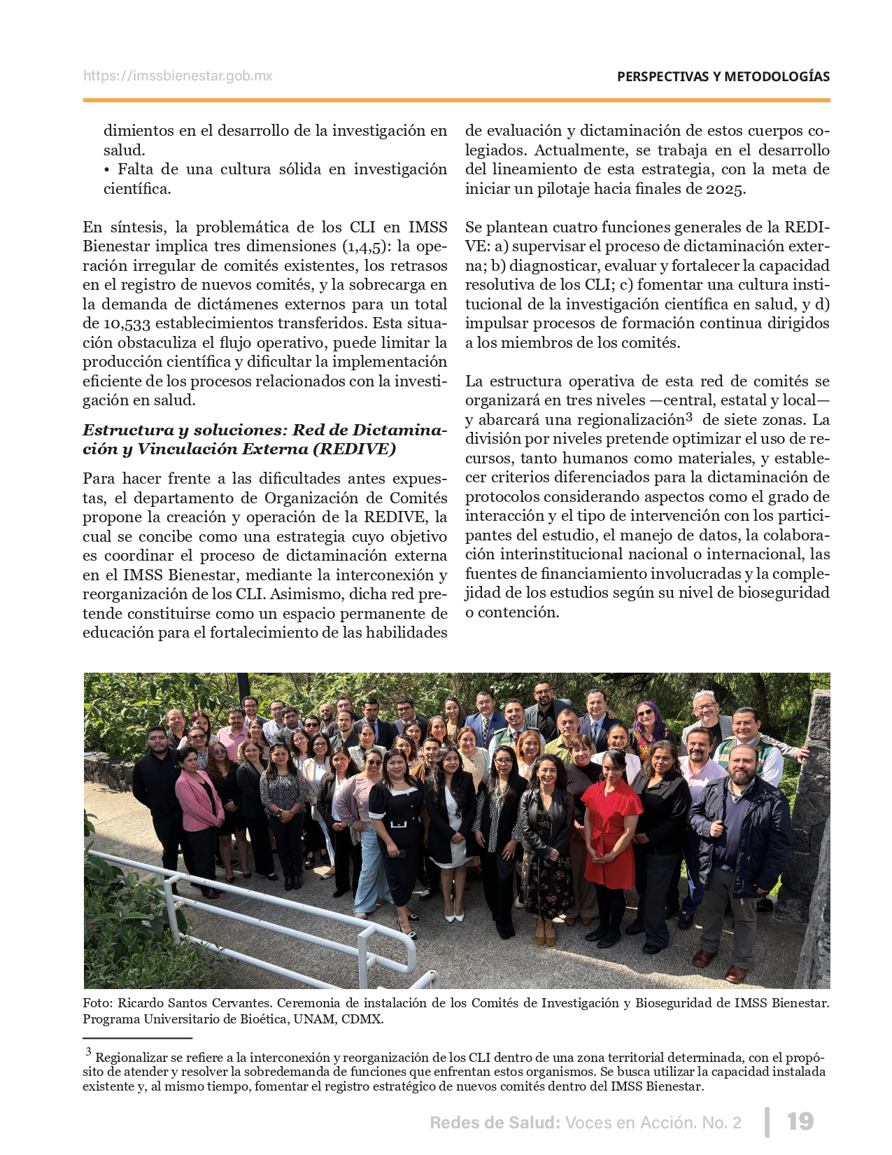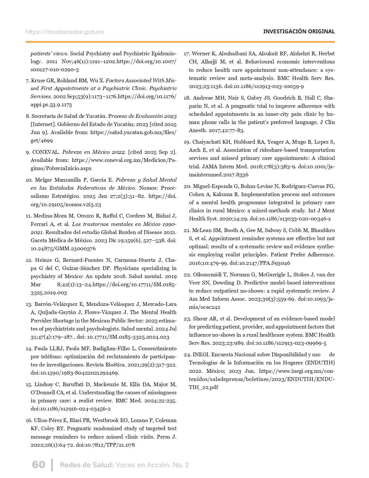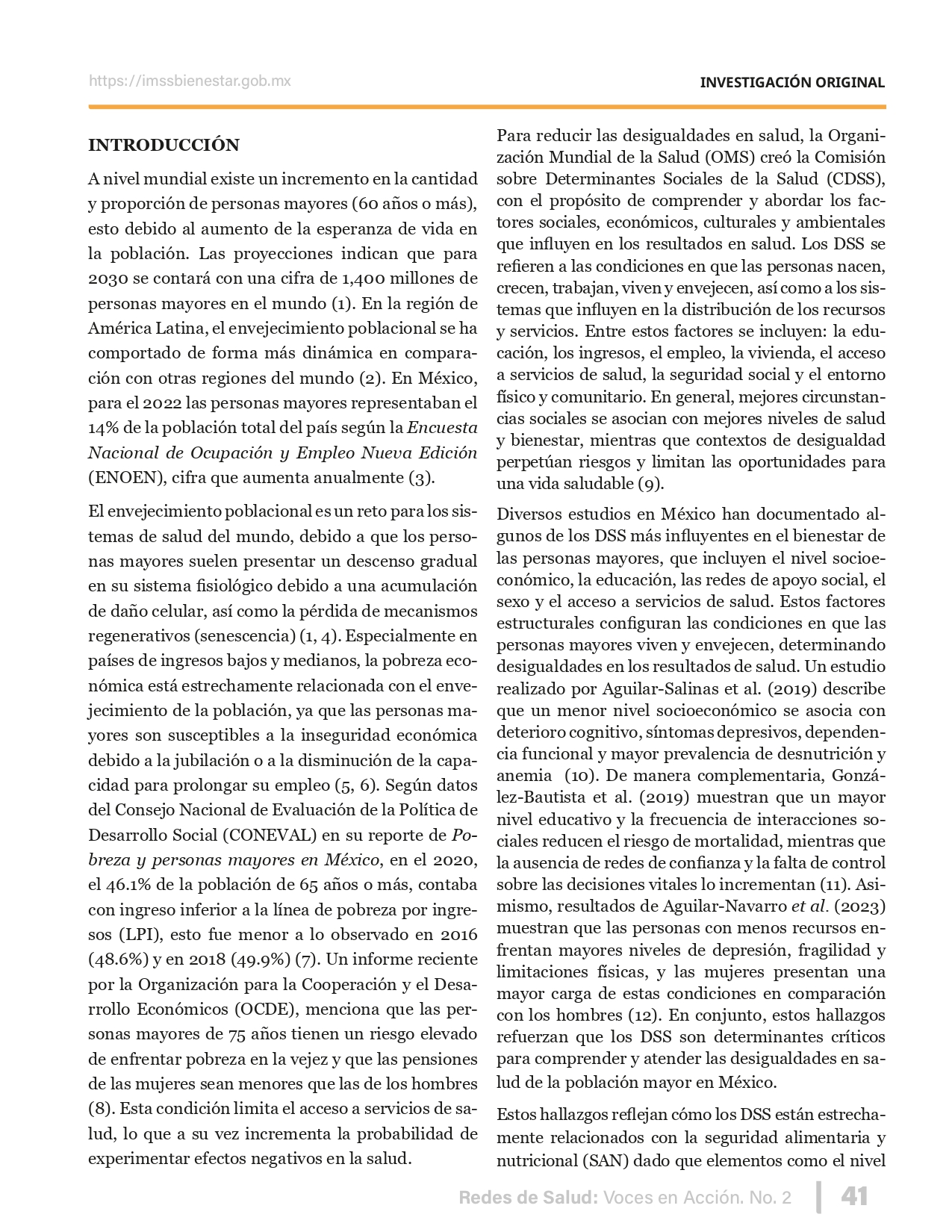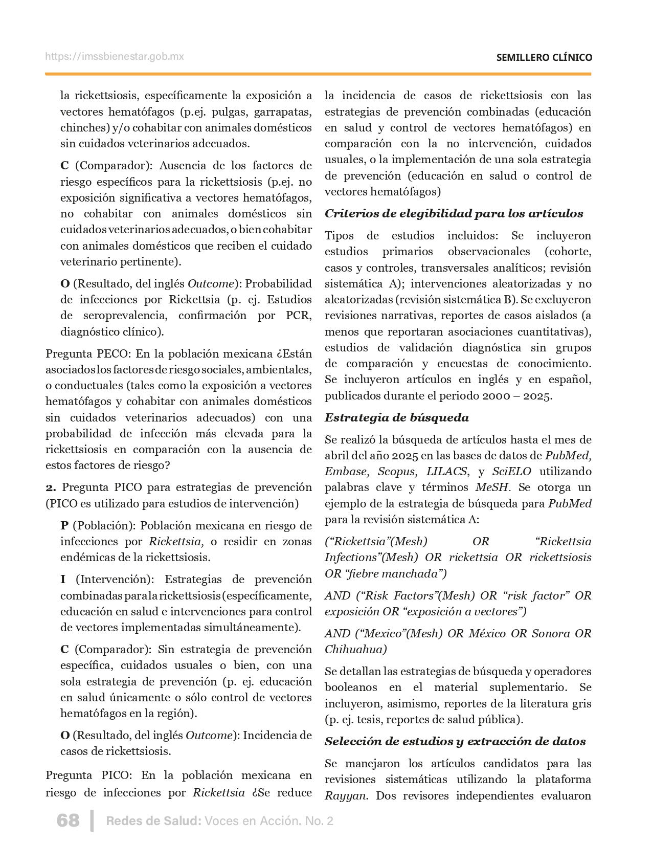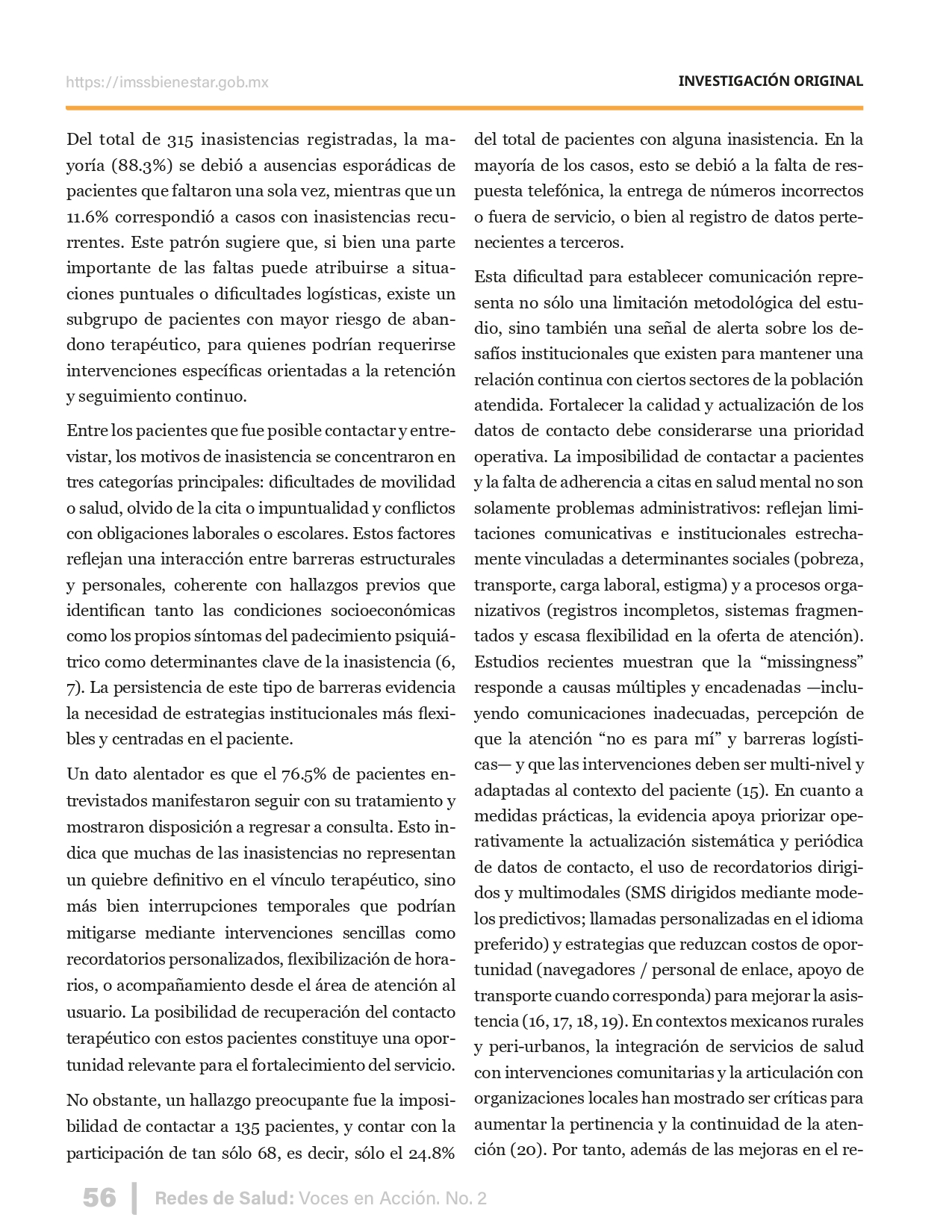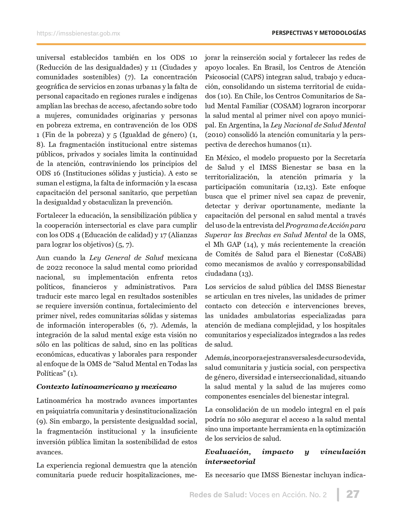 La revista considera investigaciones originales sobre sistemas de salud, con un énfasis en trabajos innovadores y de alto impacto clínico, científico y político. Su enfoque integra una diversidad de perspectivas, promoviendo el análisis crítico y reflexivo de los desafíos contemporáneos en los modelos de atención. Con una clara vocación social, la revista busca ser un referente en la difusión de conocimientos que contribuyan al fortalecimiento de sistemas de salud públicos, universales y equitativos, orientados al bienestar colectivo y la justicia sanitaria. Cada número de la revista está compuesto por diversas secciones que reflejan el carácter plural e interdisciplinario de Redes de Salud: Voces en Acción, entre ellas se encuentran: Editorial institucional; Voces desde el territorio, dedicada a entrevistas con actores comunitarios; Salud en contexto, con experiencias institucionales y análisis operativos; Perspectivas y metodologías, donde se exploran enfoques teóricos y técnicos innovadores; Semillero clínico y Reporte de casos, que visibilizan contribuciones formativas; e Investigación original, con artículos científicos que aportan al debate en salud pública y bienestar social. La revista constituye un órgano oficial de difusión científica del IMSS Bienestar. Opera como una publicación periódica con revisión por pares (doble ciego).