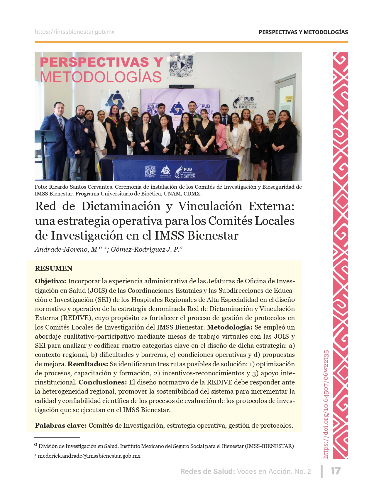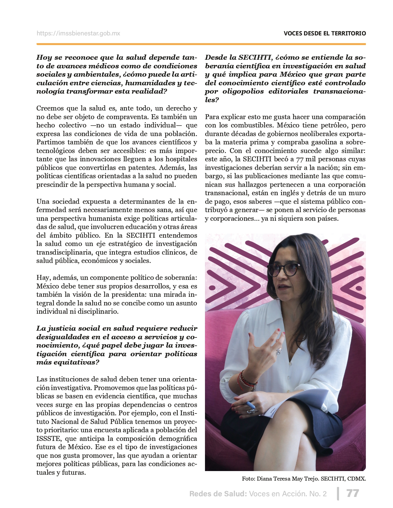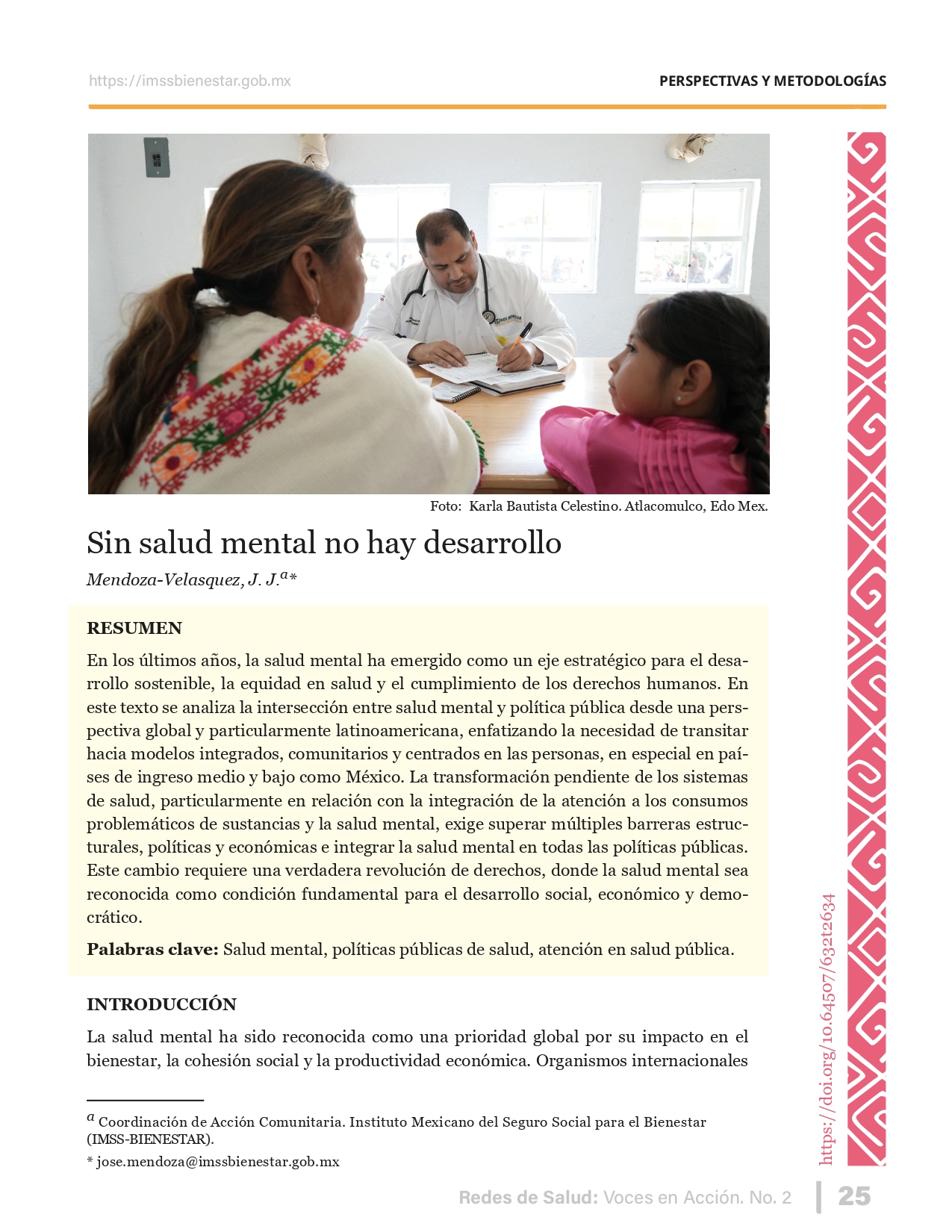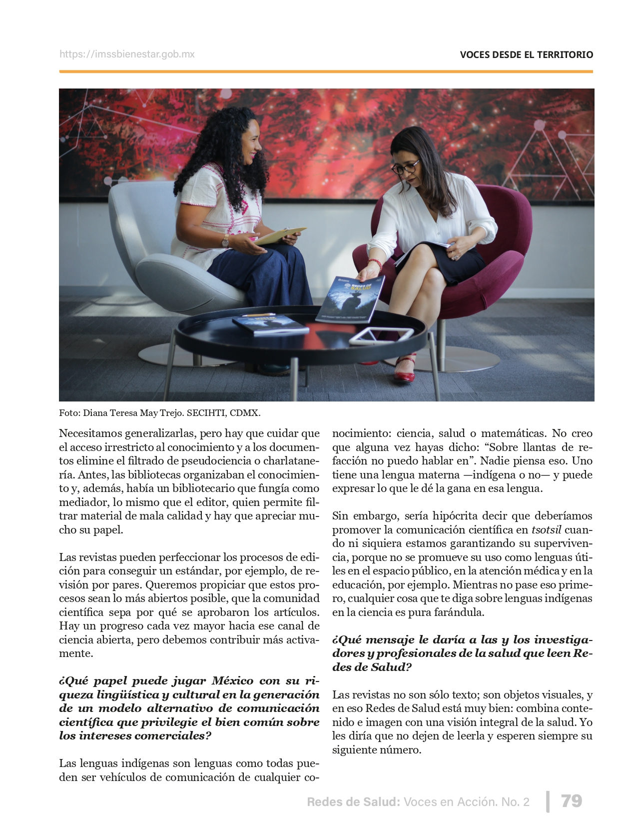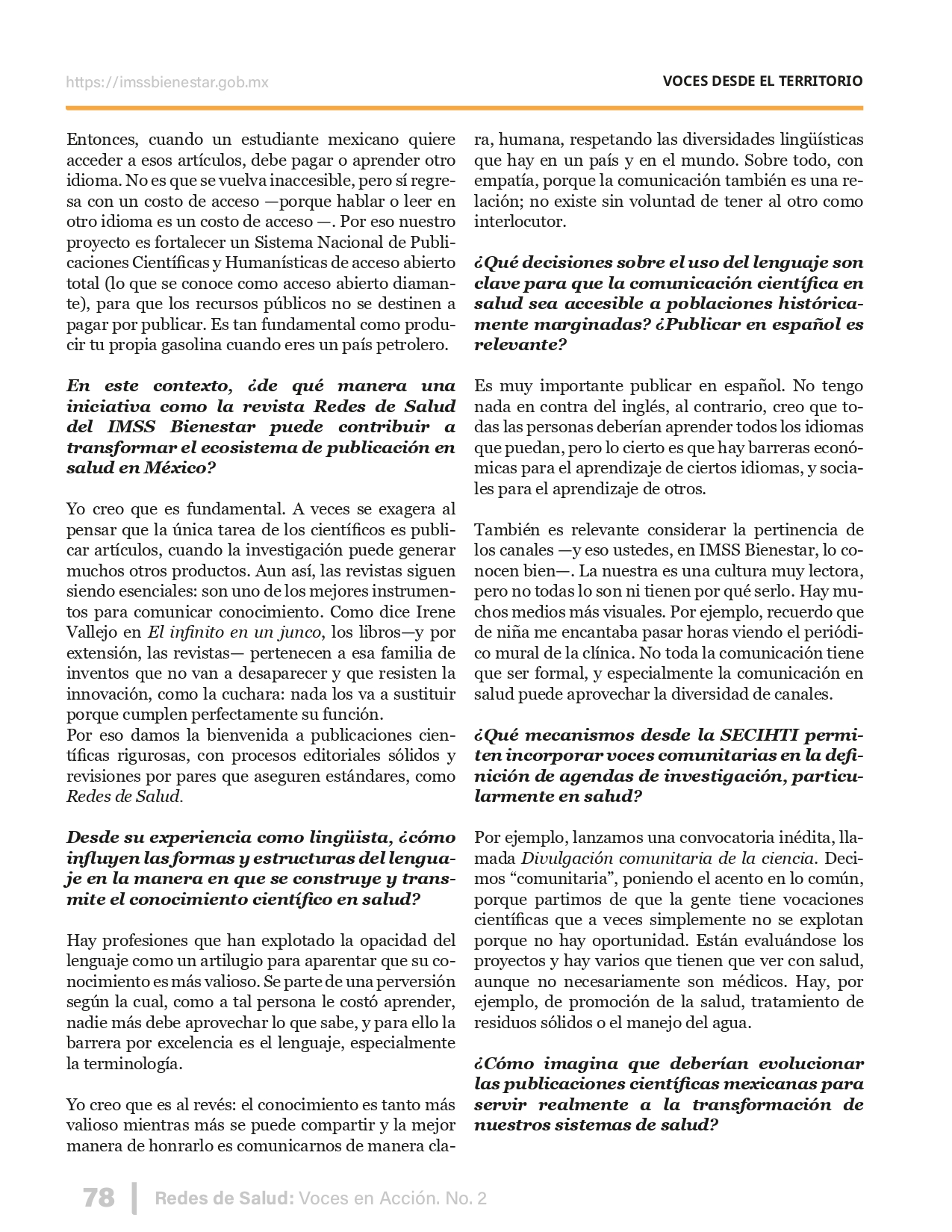 La revista considera investigaciones originales sobre sistemas de salud, con un énfasis en trabajos innovadores y de alto impacto clínico, científico y político. Su enfoque integra una diversidad de perspectivas, promoviendo el análisis crítico y reflexivo de los desafíos contemporáneos en los modelos de atención. Con una clara vocación social, la revista busca ser un referente en la difusión de conocimientos que contribuyan al fortalecimiento de sistemas de salud públicos, universales y equitativos, orientados al bienestar colectivo y la justicia sanitaria. Cada número de la revista está compuesto por diversas secciones que reflejan el carácter plural e interdisciplinario de Redes de Salud: Voces en Acción, entre ellas se encuentran: Editorial institucional; Voces desde el territorio, dedicada a entrevistas con actores comunitarios; Salud en contexto, con experiencias institucionales y análisis operativos; Perspectivas y metodologías, donde se exploran enfoques teóricos y técnicos innovadores; Semillero clínico y Reporte de casos, que visibilizan contribuciones formativas; e Investigación original, con artículos científicos que aportan al debate en salud pública y bienestar social. La revista constituye un órgano oficial de difusión científica del IMSS Bienestar. Opera como una publicación periódica con revisión por pares (doble ciego).