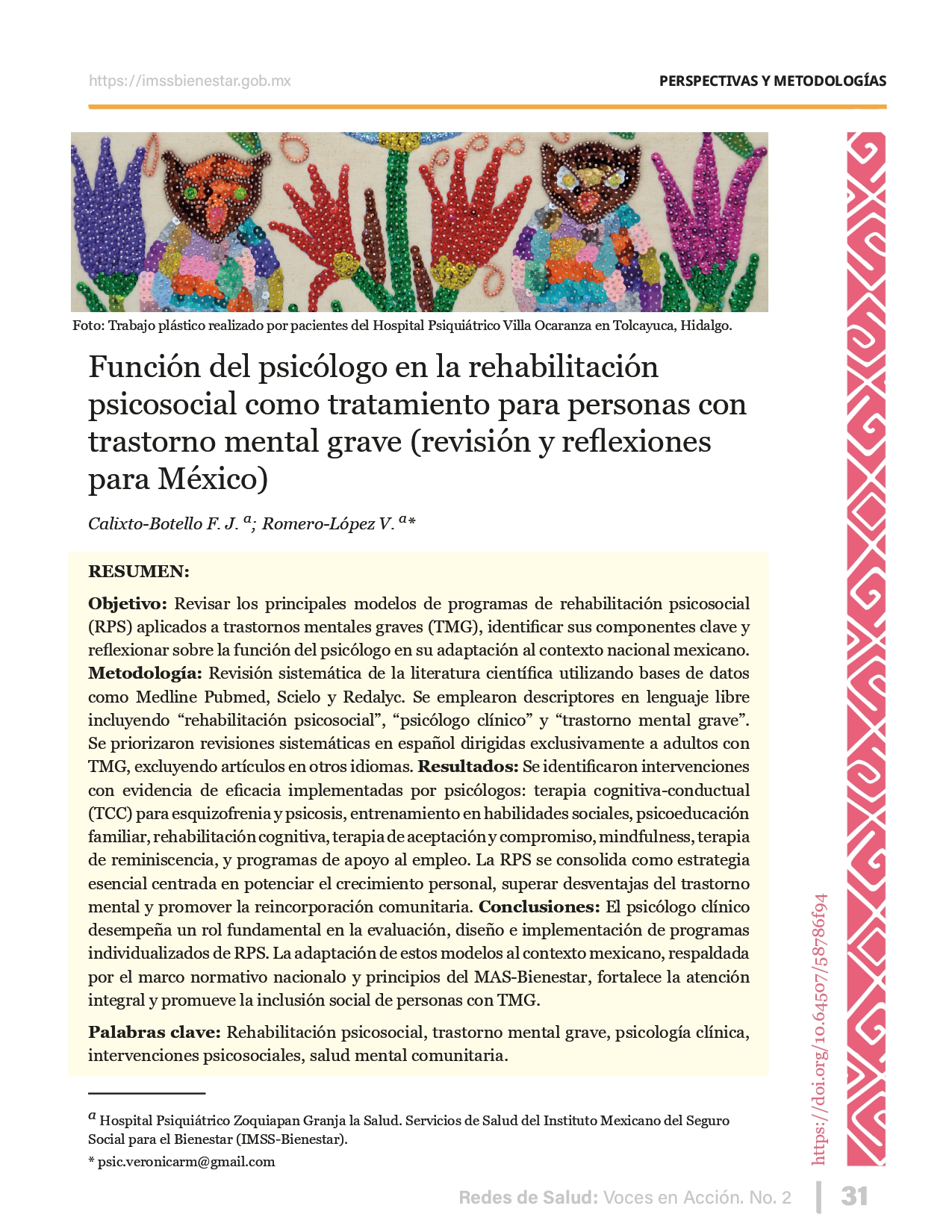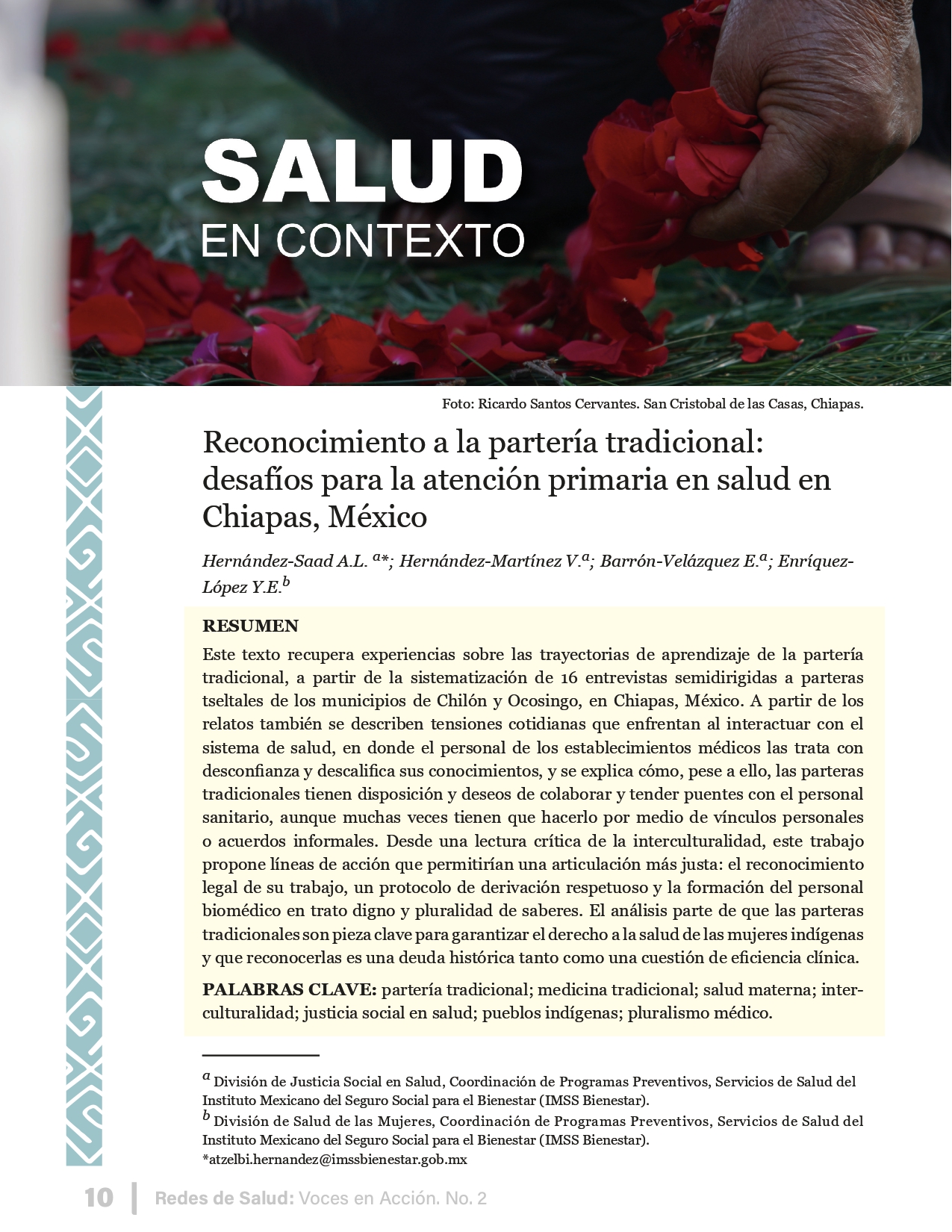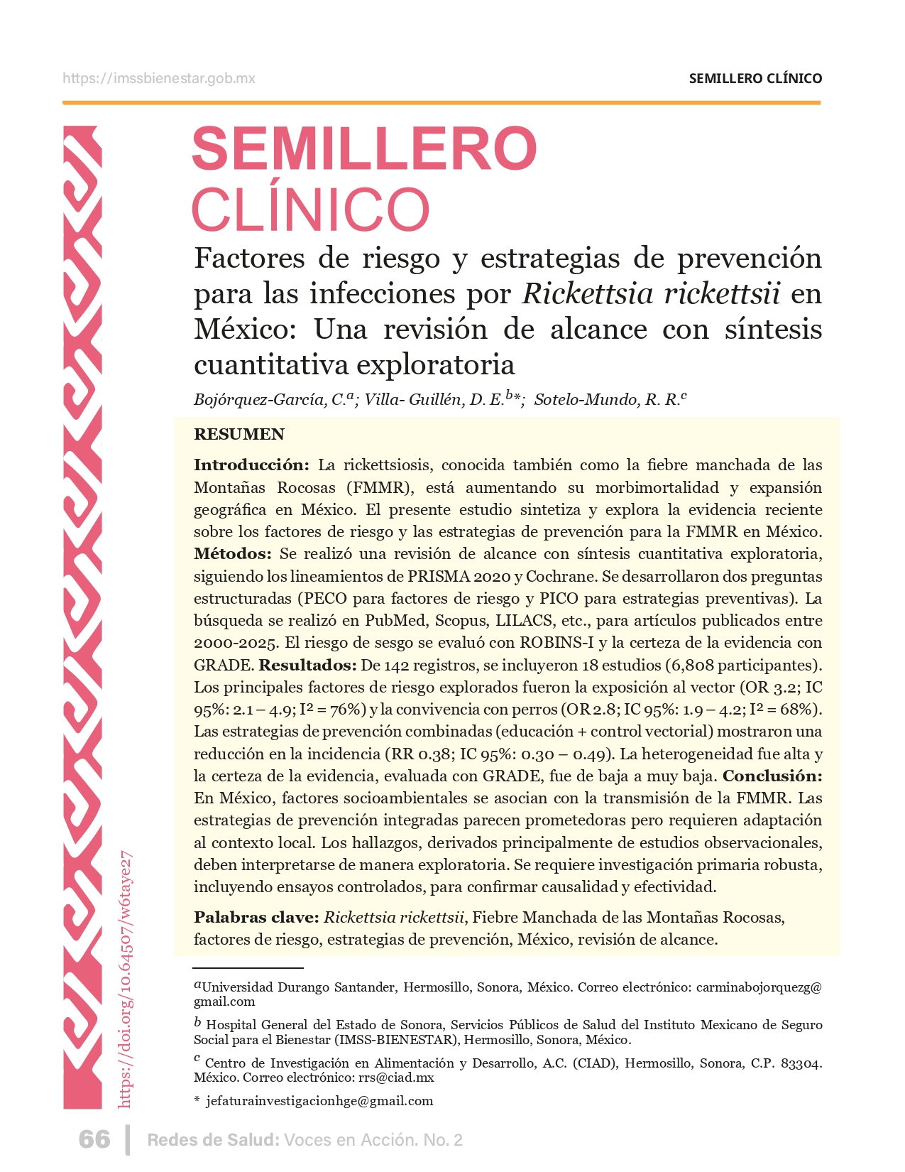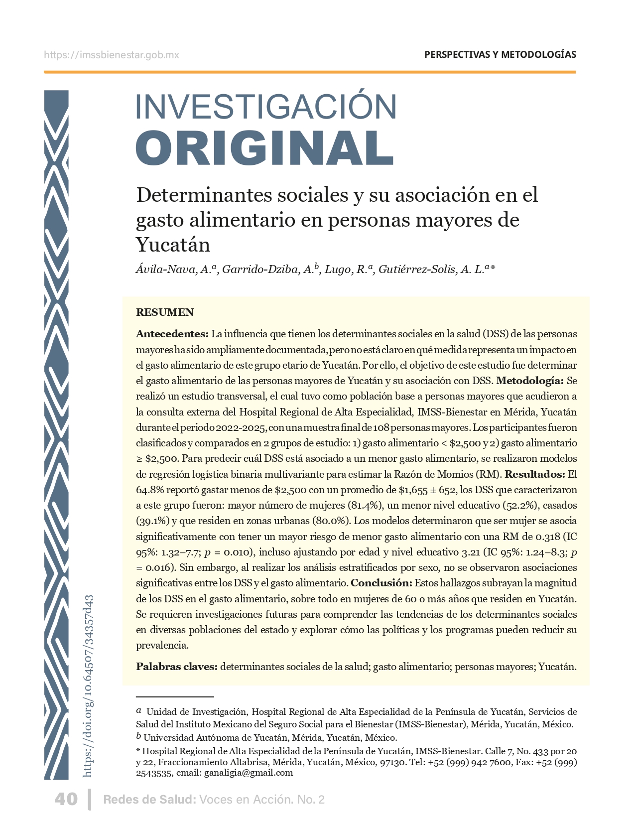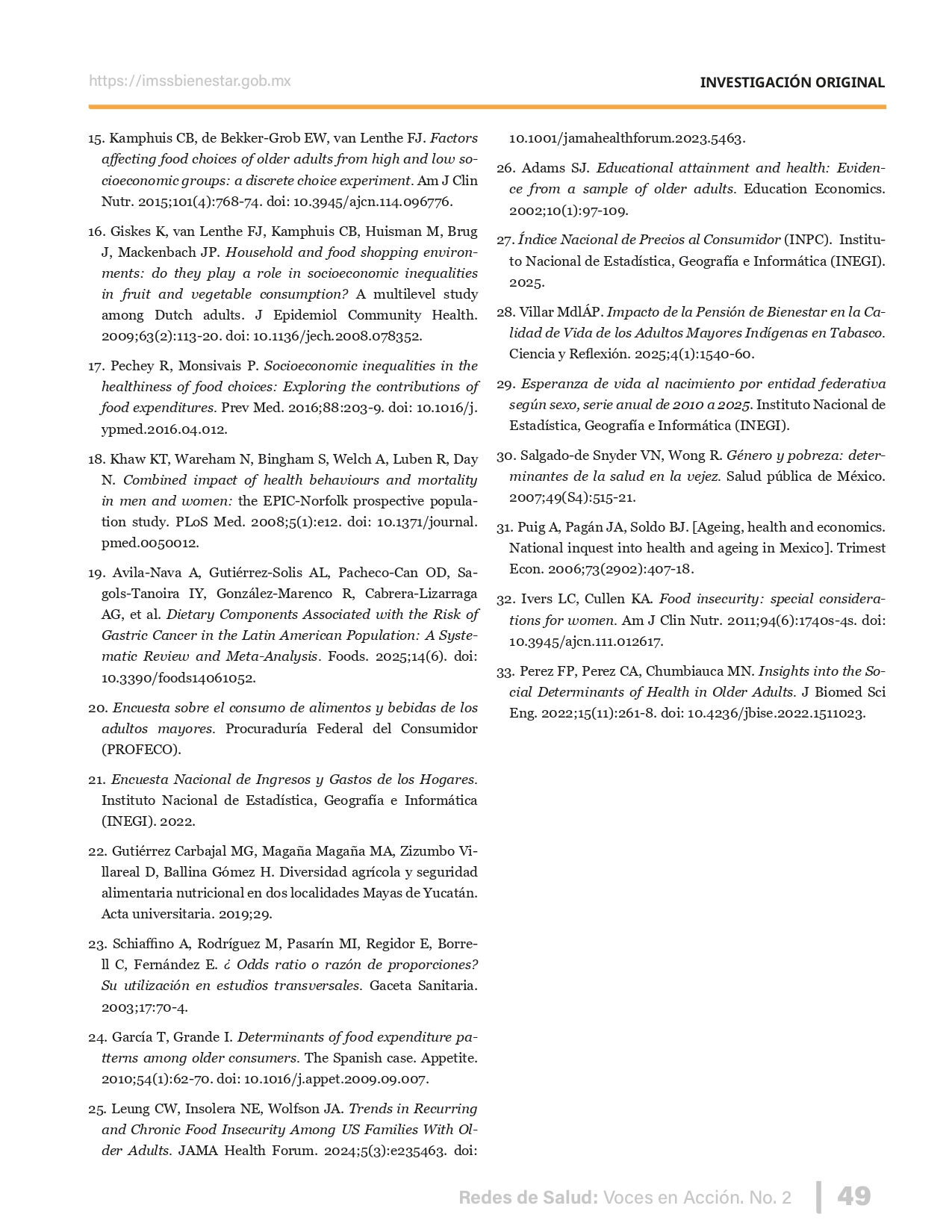 La revista considera investigaciones originales sobre sistemas de salud, con un énfasis en trabajos innovadores y de alto impacto clínico, científico y político. Su enfoque integra una diversidad de perspectivas, promoviendo el análisis crítico y reflexivo de los desafíos contemporáneos en los modelos de atención. Con una clara vocación social, la revista busca ser un referente en la difusión de conocimientos que contribuyan al fortalecimiento de sistemas de salud públicos, universales y equitativos, orientados al bienestar colectivo y la justicia sanitaria. Cada número de la revista está compuesto por diversas secciones que reflejan el carácter plural e interdisciplinario de Redes de Salud: Voces en Acción, entre ellas se encuentran: Editorial institucional; Voces desde el territorio, dedicada a entrevistas con actores comunitarios; Salud en contexto, con experiencias institucionales y análisis operativos; Perspectivas y metodologías, donde se exploran enfoques teóricos y técnicos innovadores; Semillero clínico y Reporte de casos, que visibilizan contribuciones formativas; e Investigación original, con artículos científicos que aportan al debate en salud pública y bienestar social. La revista constituye un órgano oficial de difusión científica del IMSS Bienestar. Opera como una publicación periódica con revisión por pares (doble ciego).